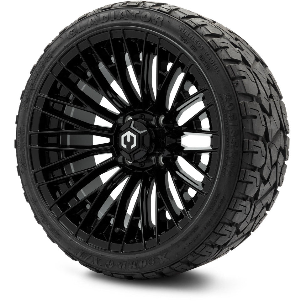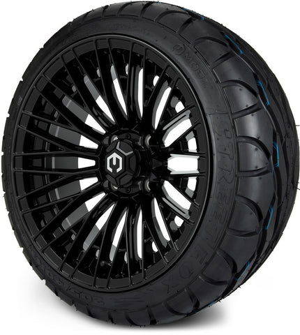 Enhance the style and performance of your golf cart with our exclusive MODZ® 14" Reaper Glossy Black wheels and low-profile tire combo. Designed with both aesthetics and functionality in mind, this set is perfect for golf cart enthusiasts looking to stand out on the course or around the neighborhood.